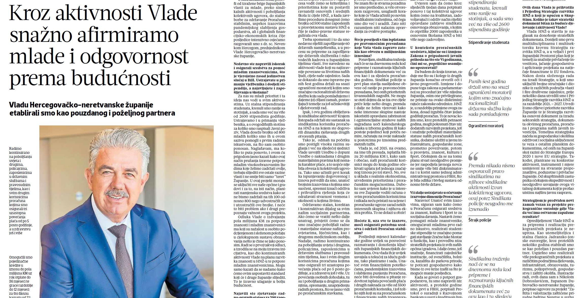 Intervju, objavljen pod naslovom ''Vladu HNK etablirali smo kao pouzdanog i poželjnog partnera'', u podnaslovu ''Kroz aktivnosti Vlade snažno afirmišemo mlade i odgovornost prema budućnosti'', prenosimo u cjelini: